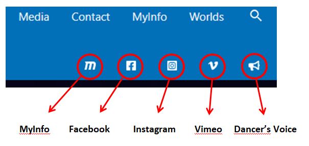 Your new website has links to all the usefull information on the top of each page (under the main menu). Simply click on the icons to access MyInfo, Facebook, Instagram, Vimeo and even Dancer’s Voice.