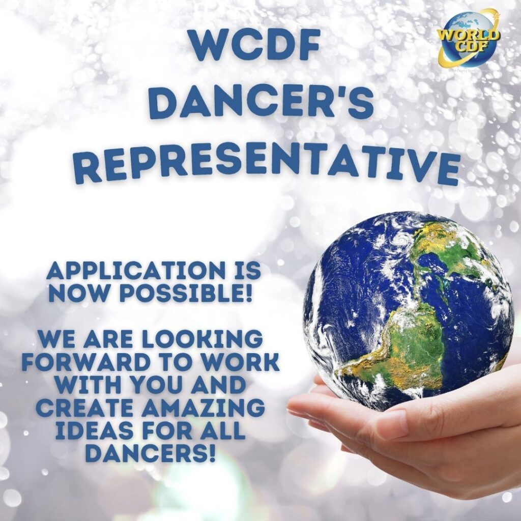 We are looking for two (2) volunteers to help us with these diverse and exciting tasks of the WCDF. We require two (2) representatives for our dancers who are willing to take advantage of the opportunity to actively participate for the benefit of all wcdf members. You will need to have organizational skills and be a sociable person, for example, when working on the development and implementation of new ideas for competitions, workshops, child and youth work.